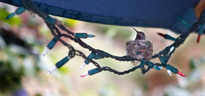 This little hummingbird has made a nest on a string of lights in our backyard.